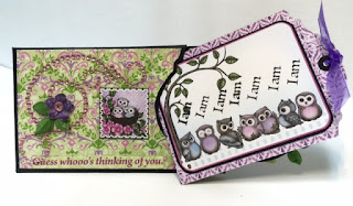 I made a custom tag by tracing the depth and width of the pocket area onto more of the patterned paper and covered the tag with the image of little owls from the paper collection. Then I stamped the "I am" above all their heads.